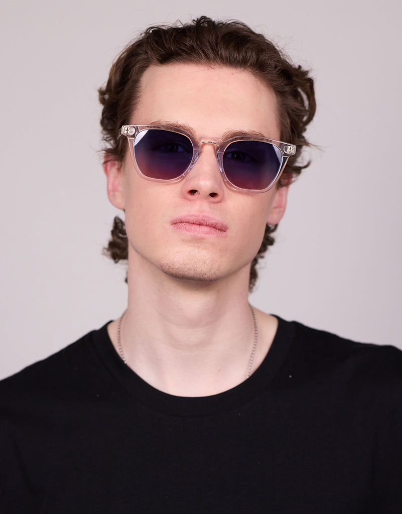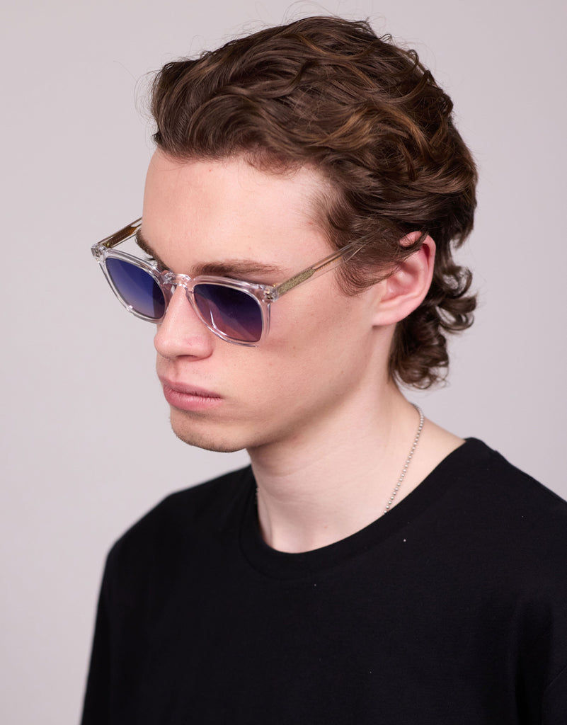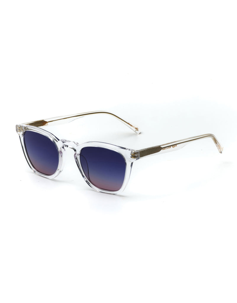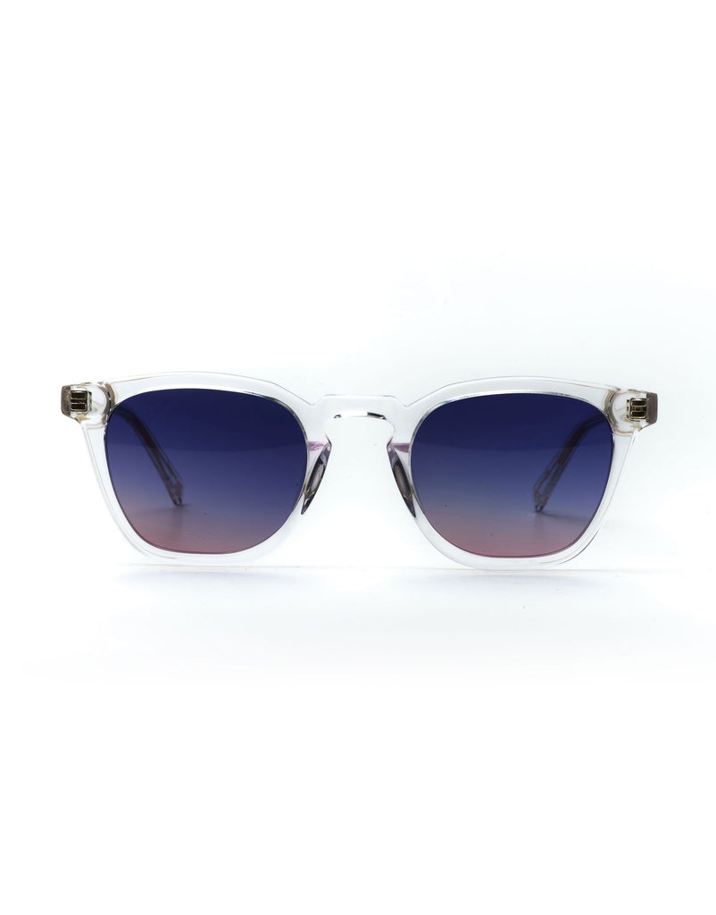 This 100% clear frame (no undertones) is complemented by a Blue to purple, Brown to green or Brown Monochromatic Lens.