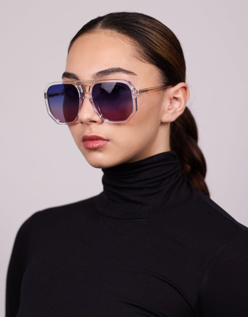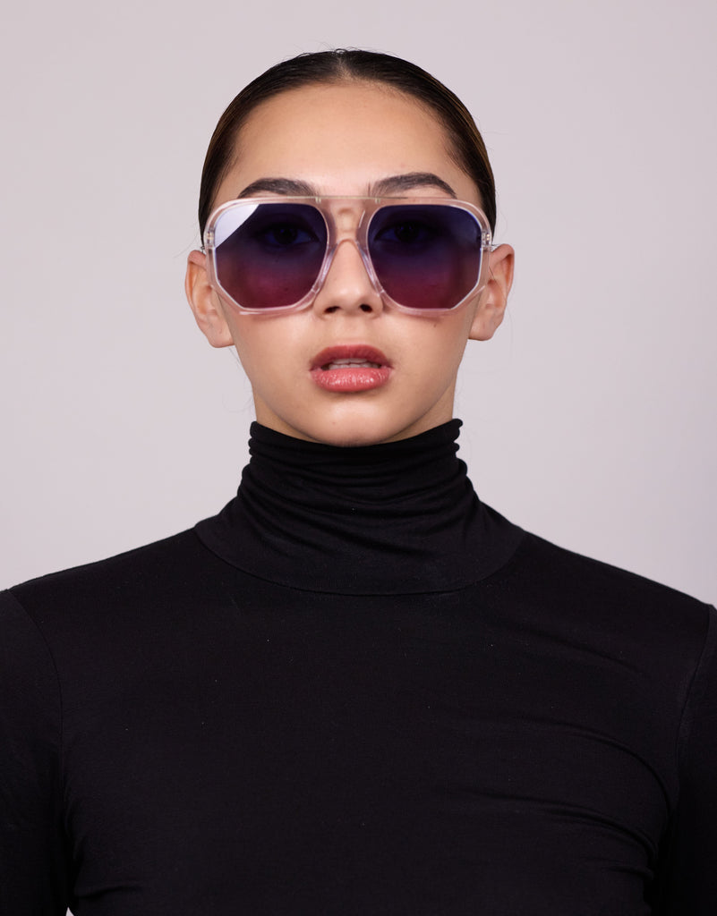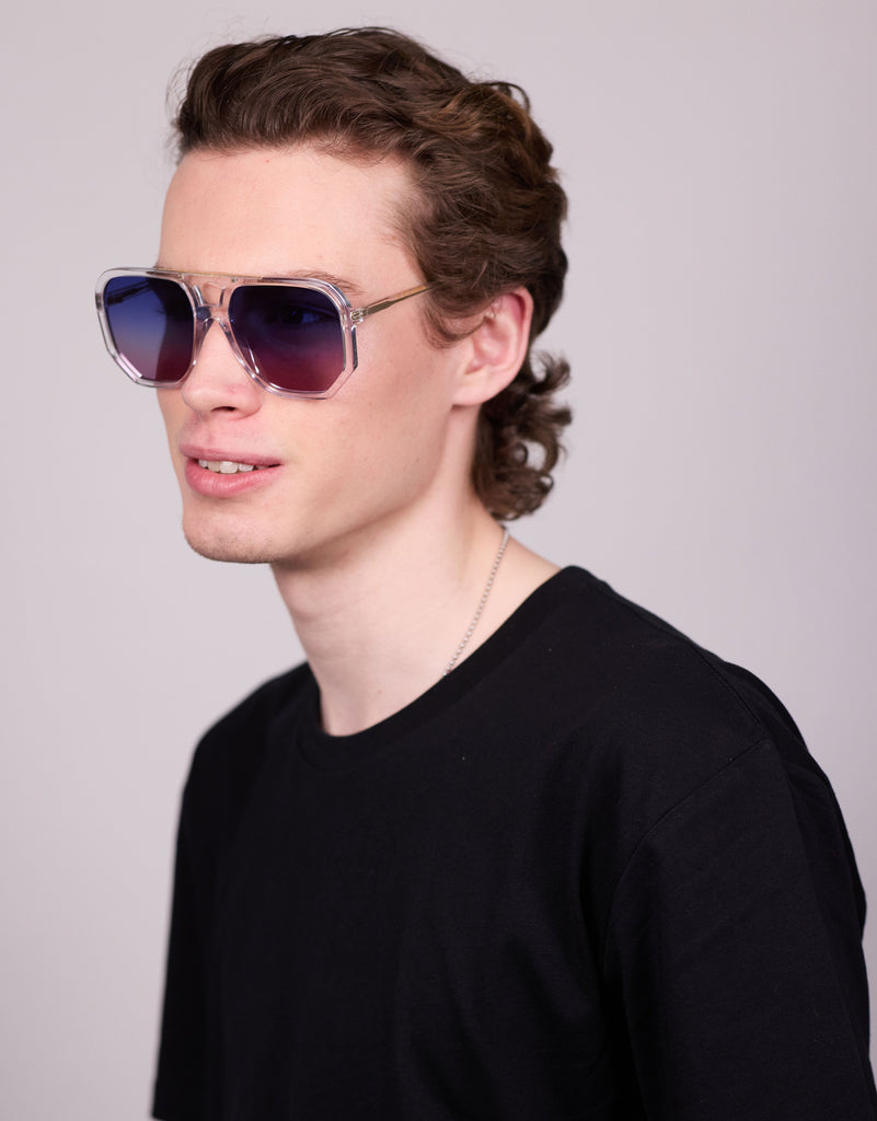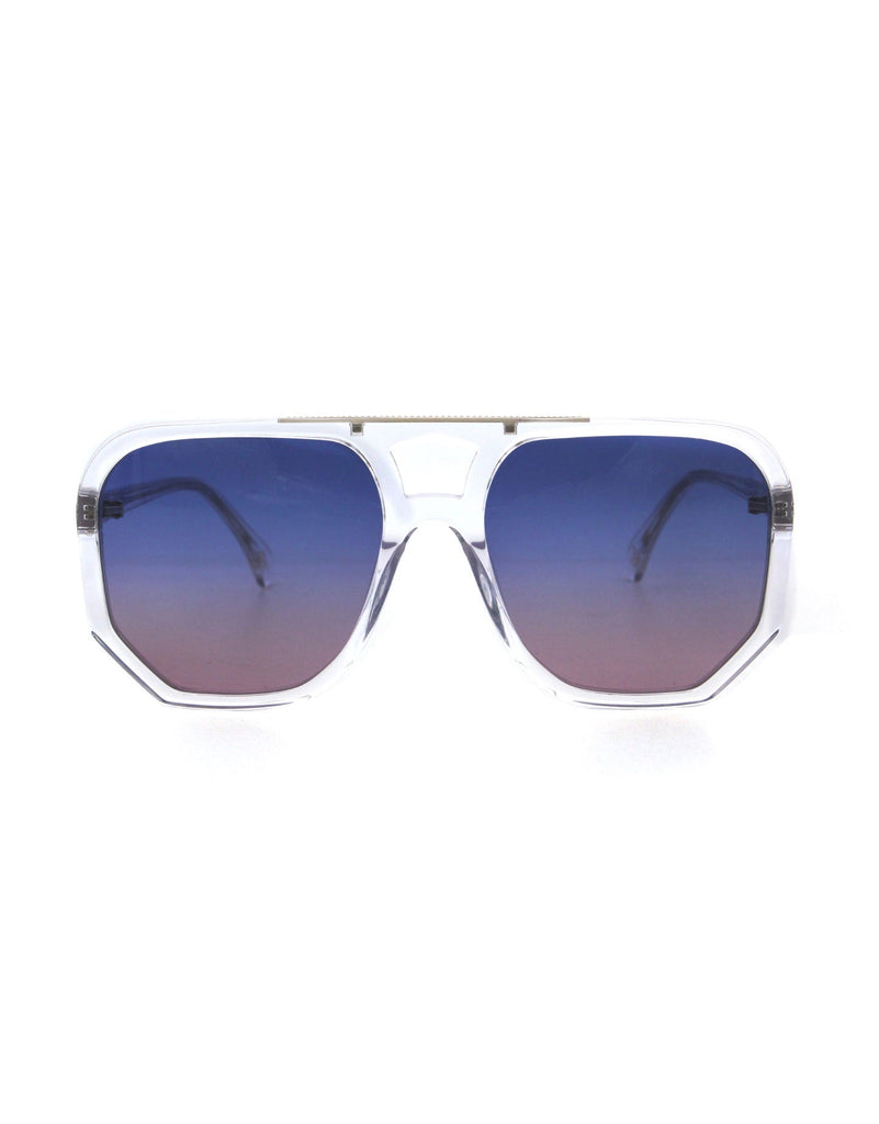 This 100% clear frame (no undertones) is complemented by a Blue to purple or Brown Monochromatic Lens.