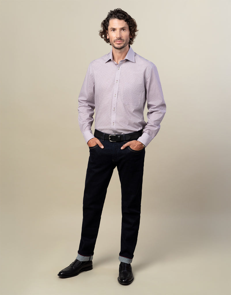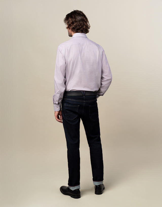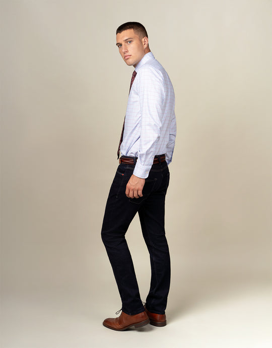 The Austin Jean in Dark Indigo Rinse is where structure meets subtlety. Designed with a relaxed taper through the leg, this fit offers generous room in the thigh before tapering cleanly from the knee down—delivering everyday comfort with a refined silhouette. Crafted from 9.5 oz stretch denim the fabric balances softness, durability, and year-round wearability.