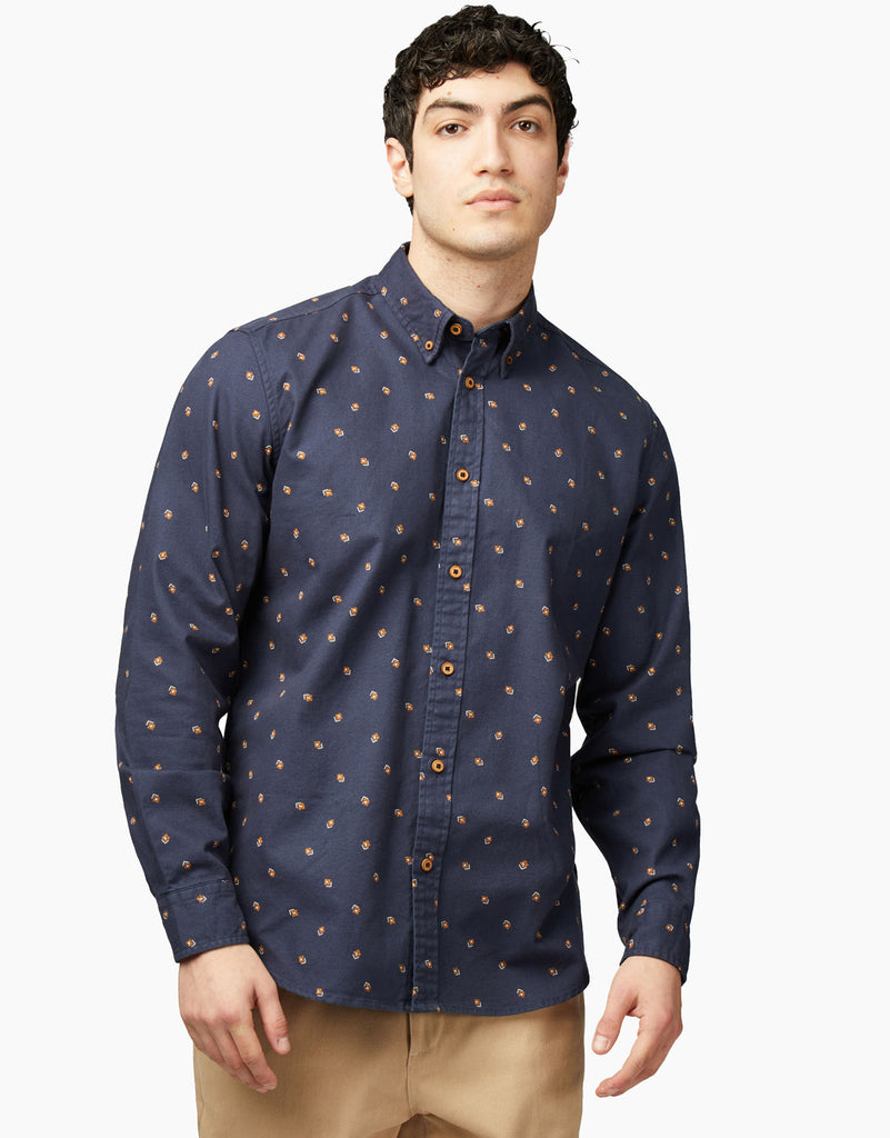 The Ben Sherman Scattered Geo Brushed Twill Indigo Shirt is an easy way to introduce pattern into your wardrobe without going overboard. Crafted from 100% cotton brushed twill, it offers both comfort and durability, while the scattered geo print adds subtle character. The classic fit, two-finger button-down collar, and curved hem provide a timeless silhouette, finished with a woven Ben Sherman label at the side seam. Pair it with chinos for a smart-casual look or layer it under a jacket for an effortlessly cool ensemble.
