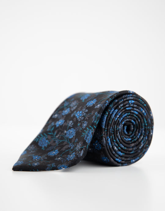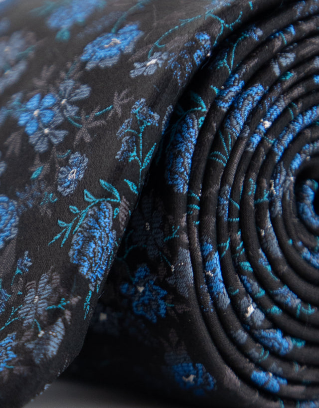 This 100% silk tie combines the richness of black with the vibrancy of blue in a confident floral pattern. Designed for versatility, it adds just the right amount of flair to formal suiting without overpowering the look. A refined option when the occasion calls for something a little more considered.