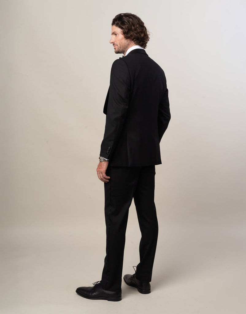 Not all tuxedos are created equal. The Bryan Shawl Collar Jacket and Ferry Trouser offer a soft, refined take on black tie. Super 120’s wool lends a smooth drape and lightweight touch, while thoughtful tailoring—side vents, side adjusters, a crisp silhouette—makes this set as comfortable as it is sophisticated. For the modern man who dresses to feel as good as he looks.