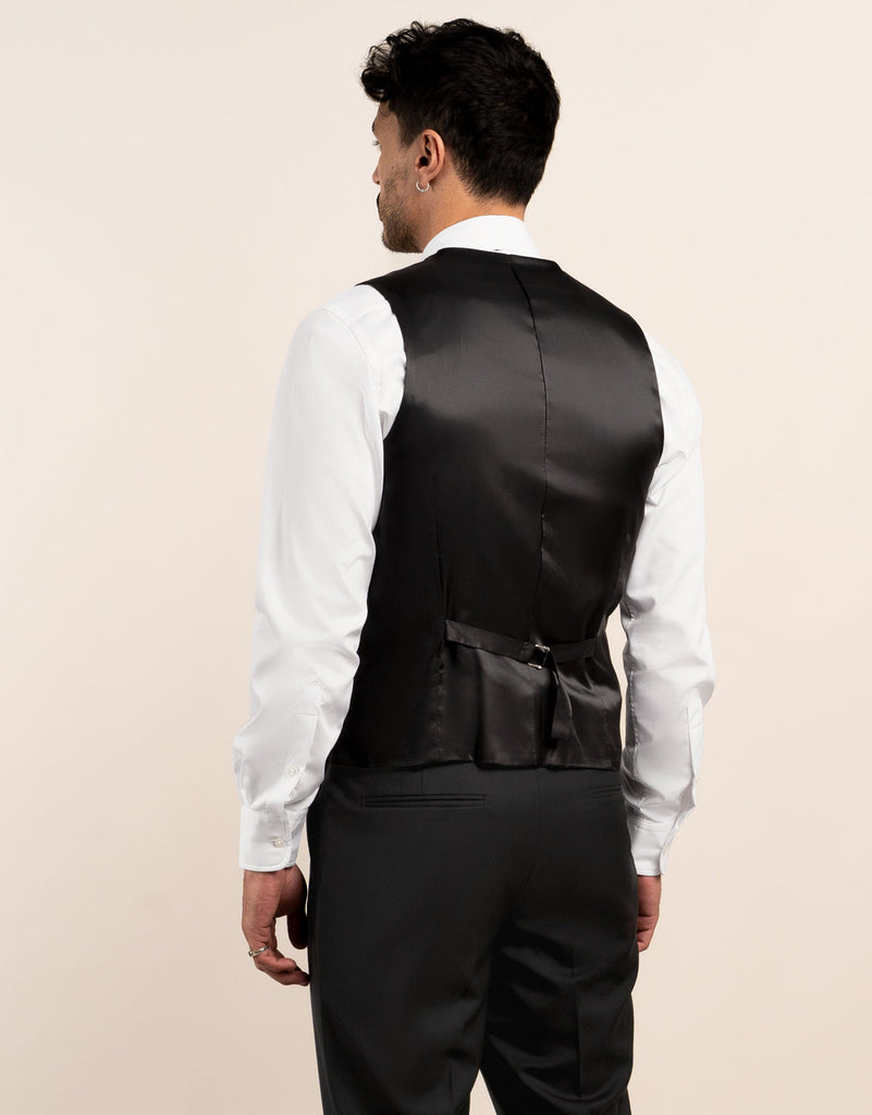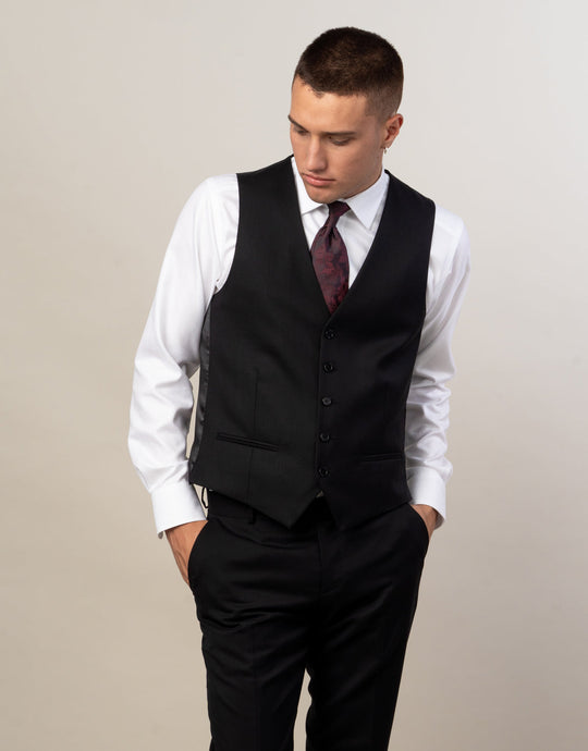 Elevate your style and comfort with the Churchill Jet Black Waistcoat. Tailored with the finest pure merino wool, this waistcoat boasts a super 120's quality that sets it apart. The perfect choice for any event, this waistcoat is a versatile addition to your wardrobe. To make a lasting impression, pair it with the matching jacket and trouser for a refined three piece suit.