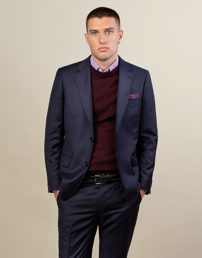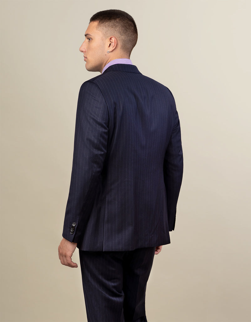 Step up your style with the Cooper Navy Pinstripe Suit Jacket—a sharp, sophisticated essential. Cut from premium Italian Reda Super 130’s wool, it offers a luxurious texture with lightweight breathability. The notch lapel, two-button closure, and side vents ensure a sleek, tailored look, while pick stitching highlights its expert craftsmanship. Designed in an Original Fit, it’s available in Short and Tall sizes for a perfect fit. Pair it with the Lotus Navy Pinstripe Trouser to complete the ultimate power suit.