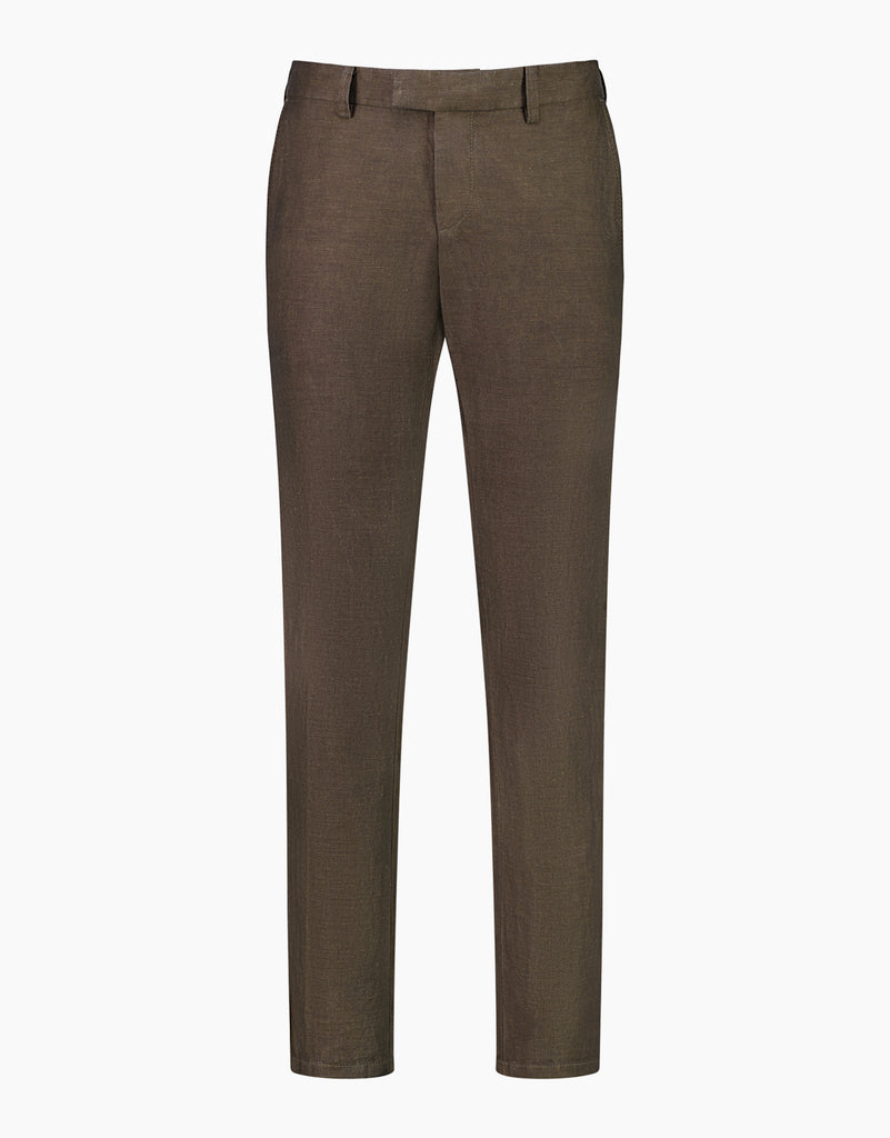 These classic straight-leg trousers exemplify how to merge comfort with smart attire. Tailored from a soft and lightweight blend of cotton and linen, this pair is crafted with a compact weave so that they fall sharply and features an understated birdseye weave in brown. Pair with a matching Split jacket for a uniformed look or clash with another shade to make a bolder statement.