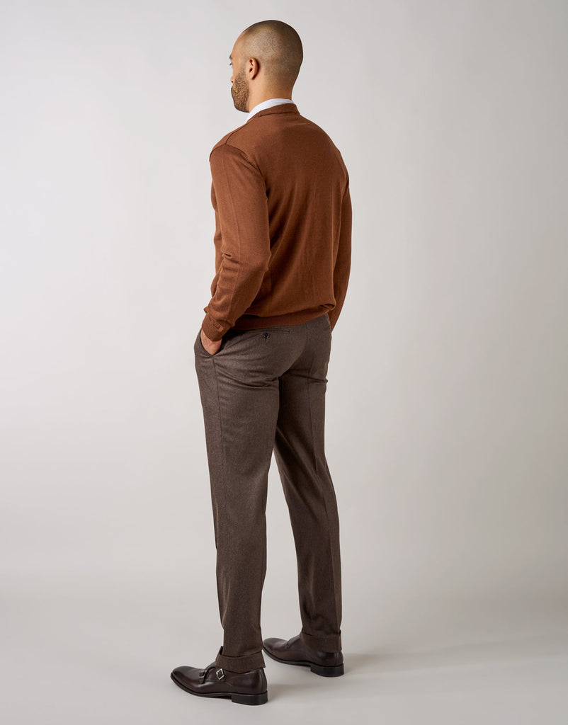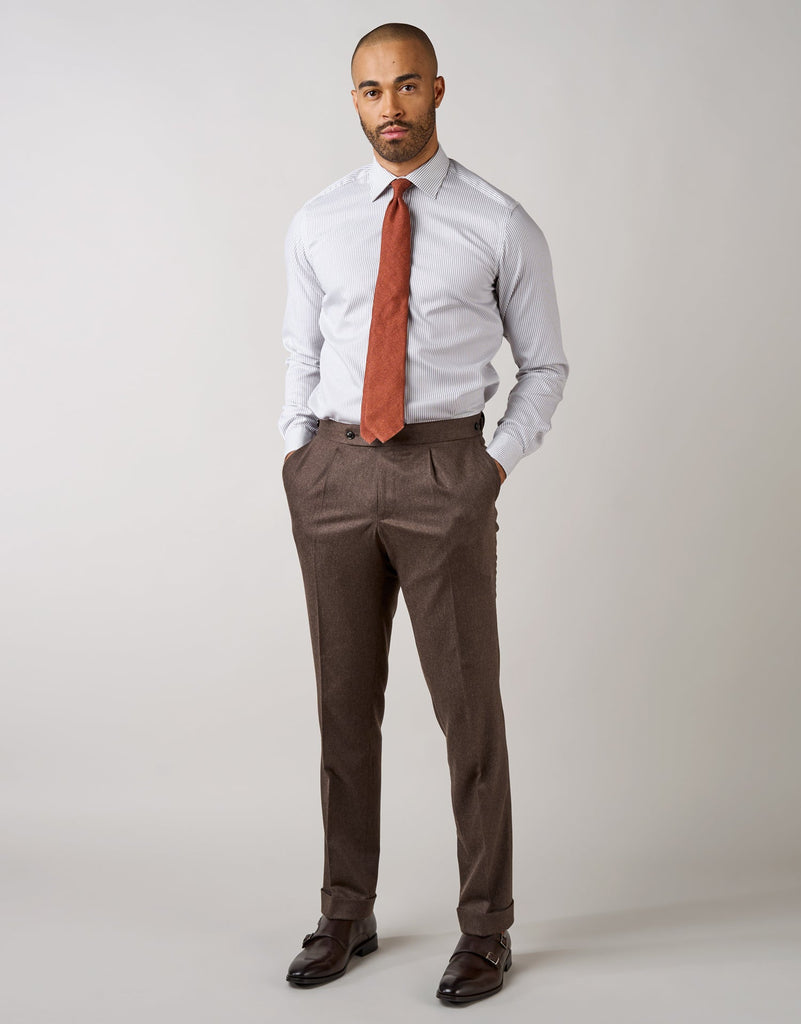 Experience the ultimate blend of comfort and style with Evans Brown Stretch Flannel Trouser. Designed to offer a little more room across the thigh with a single pleat, these trousers also feature an adjustable waistband for maximum comfort. Made from a luxurious Italian blend of wool, and elastane, these trousers are perfect for everyday wear.