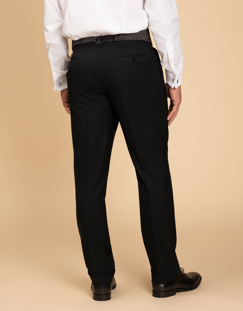 The Evans Jet Black Trouser blends style and comfort effortlessly. Made from pure Super 120’s merino wool, these trousers offer a smooth, refined finish with excellent breathability. Perfect for upgrading your wardrobe, they add a sharp and confident look to any outfit, whether for the office or special occasions. Featuring a single pleat, elastic side adjusters, and a cuffed hem, they pair seamlessly with a matching jacket and waistcoat, tailored to suit you perfectly.