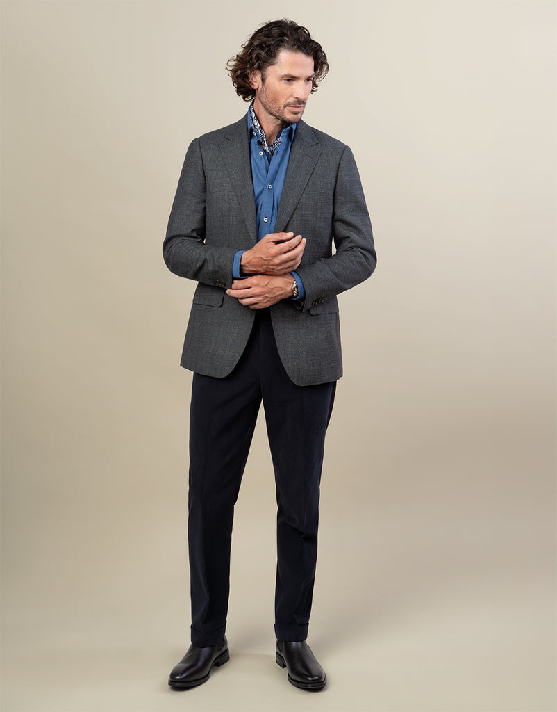Our fullest fit across the Jacket chest and abdomen and in the Trouser thigh and leg. Neither too slim nor too classic, regular fits perfectly in between.