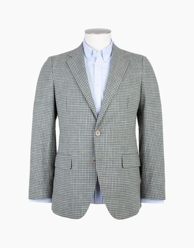 Crafted from a premium blend of wool, cotton, line and a touch of elastane for added comfort. It is tailored with a shorter cut than a suit jacket making it easy to dress up or down with chinos or jeans or dress pants. Shades of green yarns are woven together to make the gun check pattern.