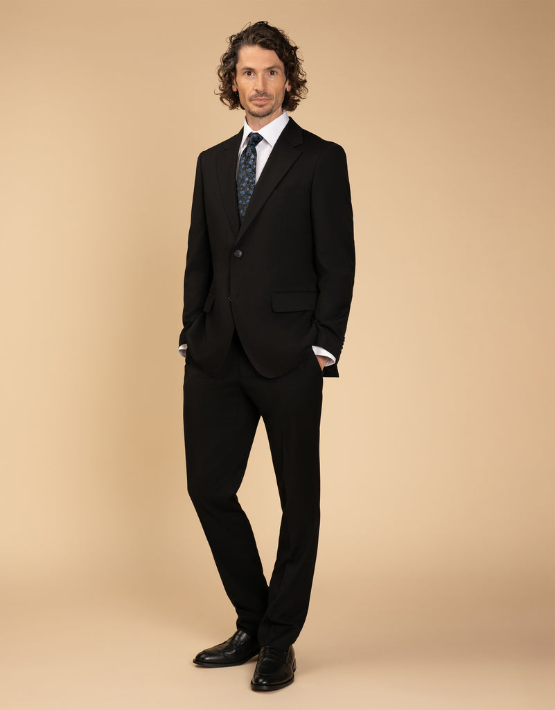 Designed as a coordinated two-piece, the Lido Black Suit brings effortless cohesion. The jacket and trousers are perfectly balanced, creating a modern silhouette that moves with you while looking sharp. Whether you wear it for work, formal occasions, or smart-casual events, this suit combines timeless tailoring with modern practicality.