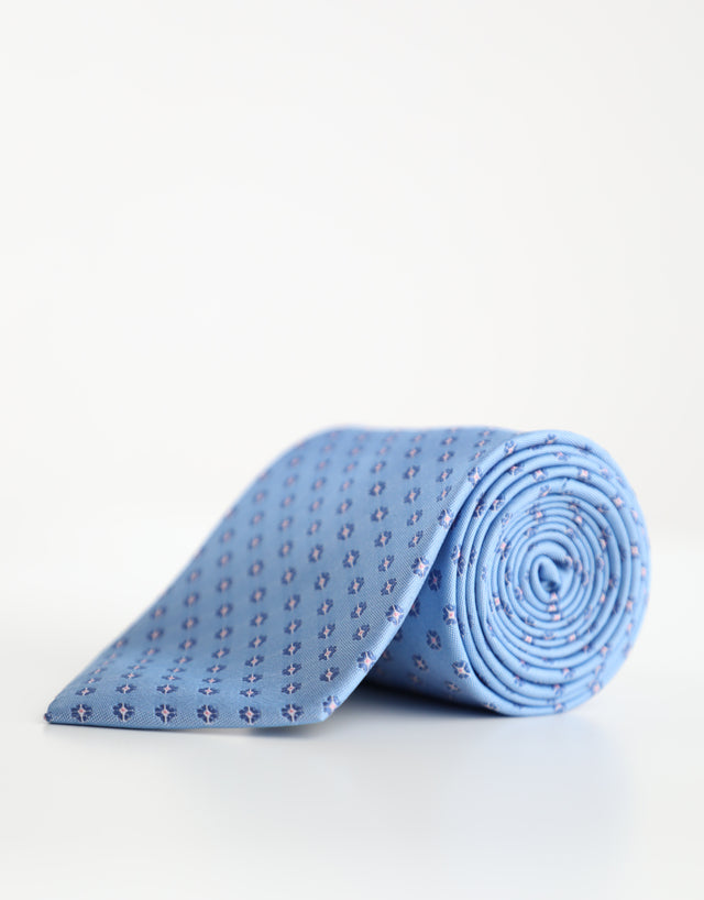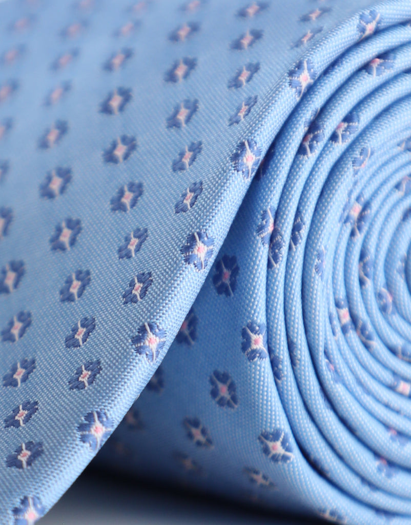 A flourish of colour meets a framework of form. This tie’s repeating floral-geometric pattern in pastel pink and blue offers visual texture without excess. Tailored in 100% silk and cut to an 8cm width, it elevates any plain shirt or navy blazer—refined, with just the right amount of character.