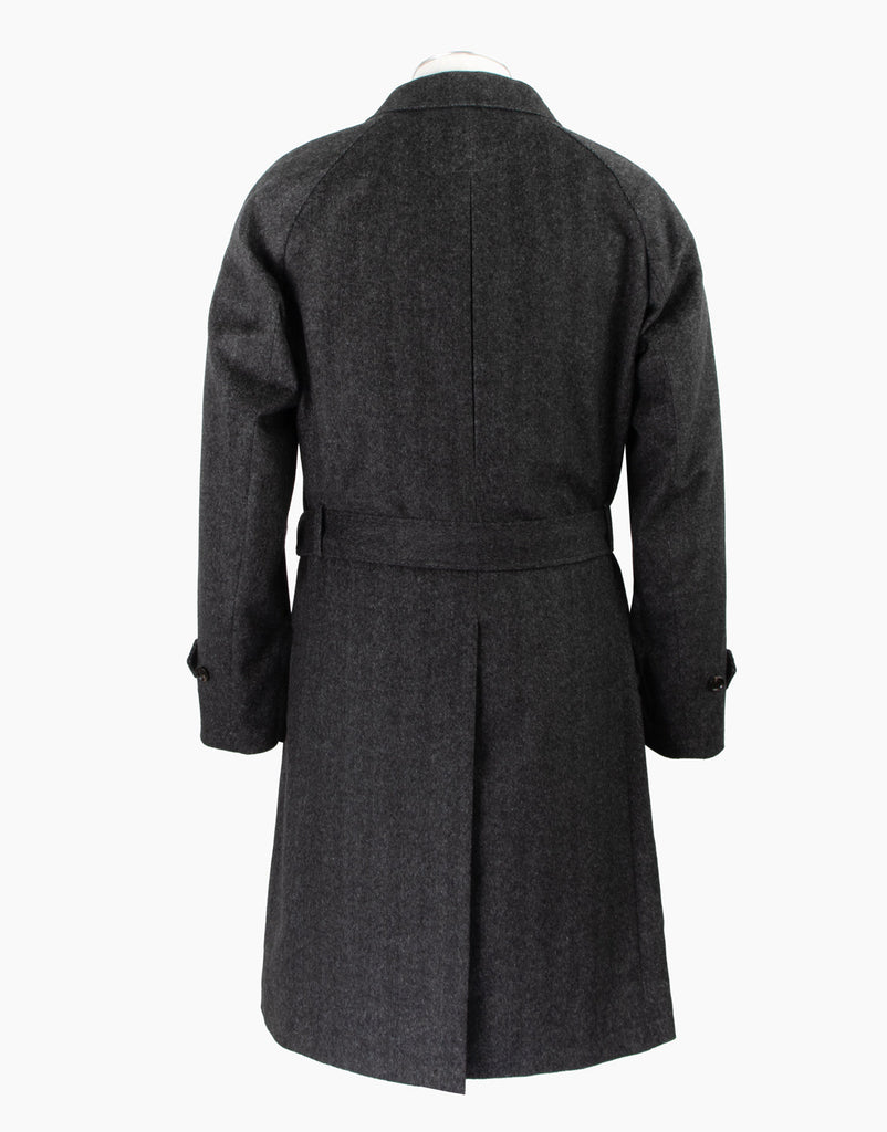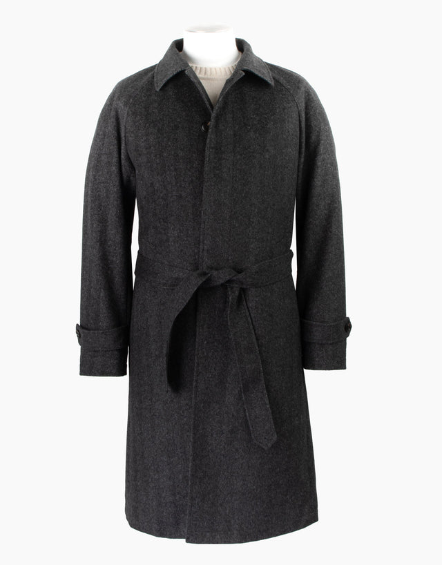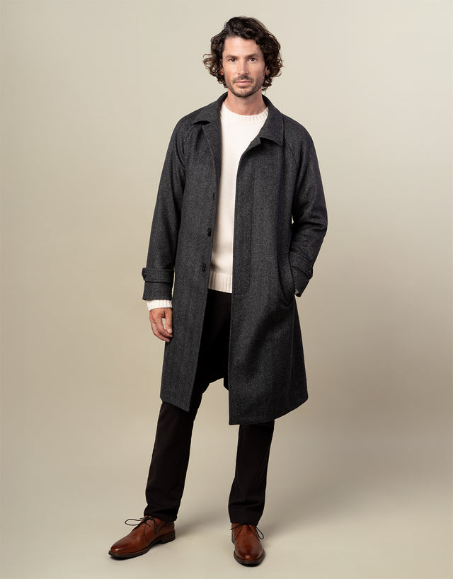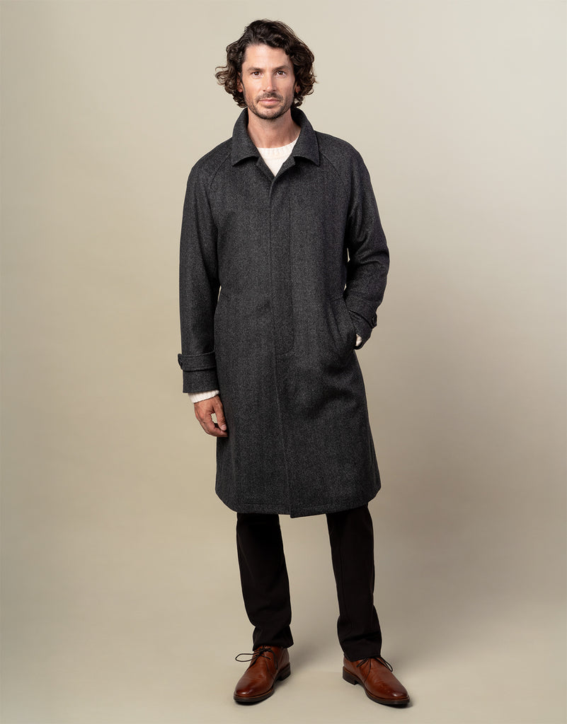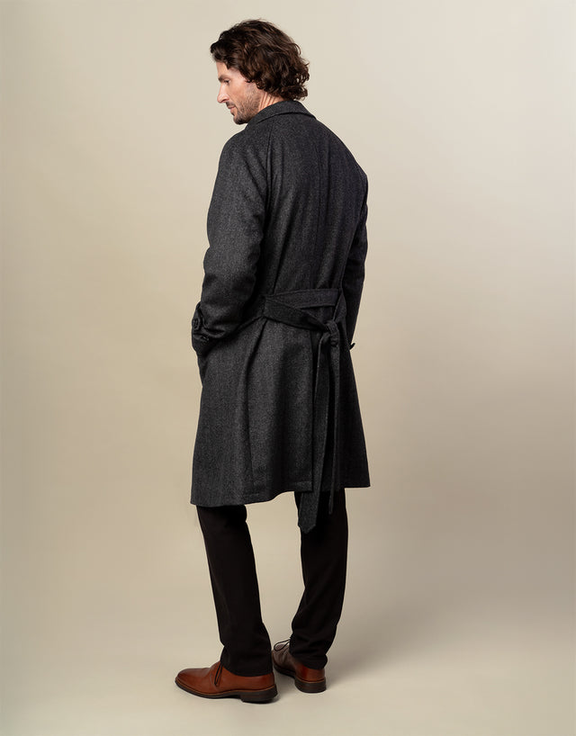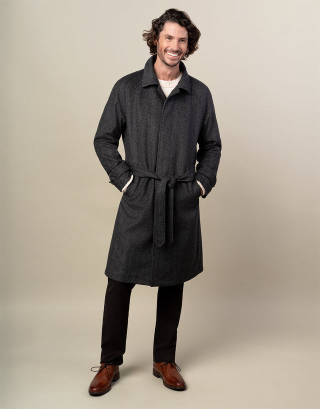 A wardrobe essential for the modern gentleman, the Loch Charcoal Grey Herringbone Raglan Coat blends heritage craftsmanship with contemporary style. Made from Italian wool-cashmere fabric, it offers a soft yet structured feel, perfect for layering. The hidden button front, centre vent, and removable belt provide a refined, tailored aesthetic, while the raglan sleeves ensure comfort and ease of movement. Available in Short and Tall sizes, this coat is an investment in effortless sophistication.