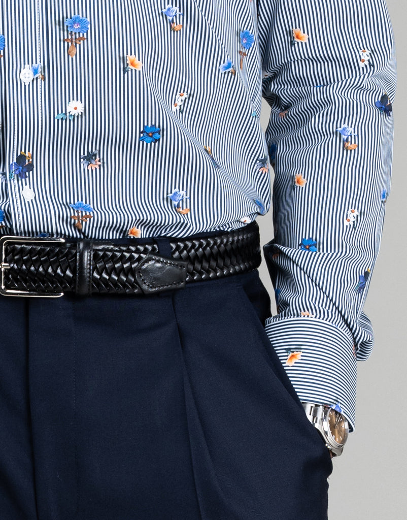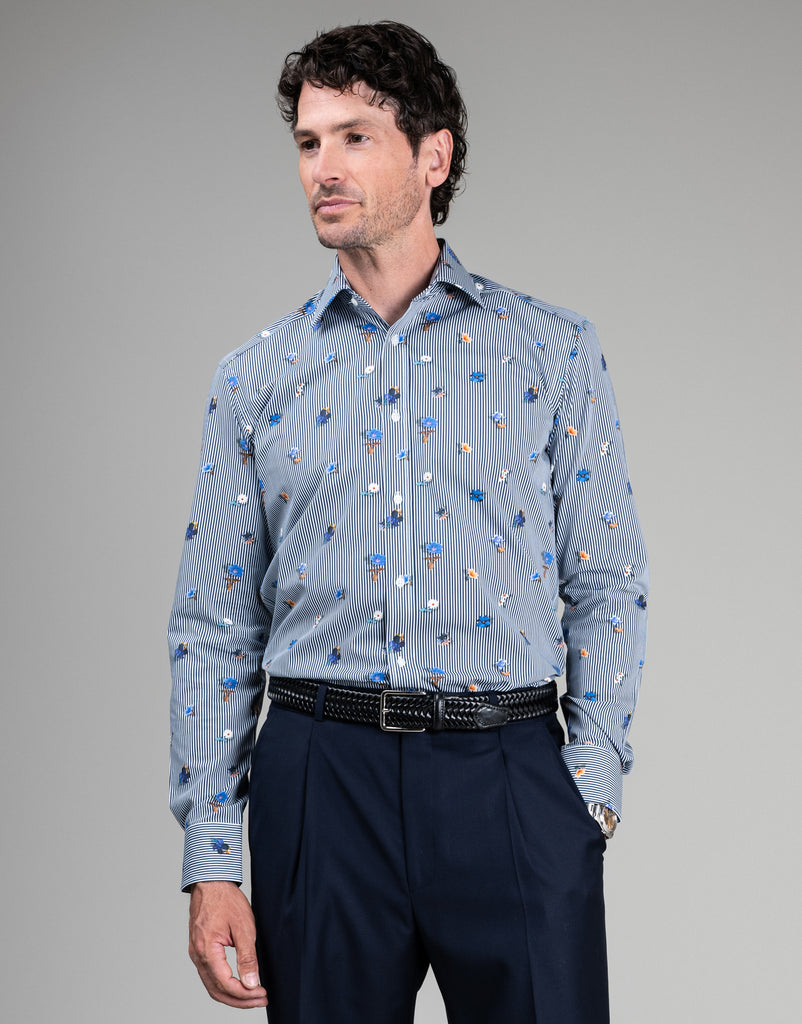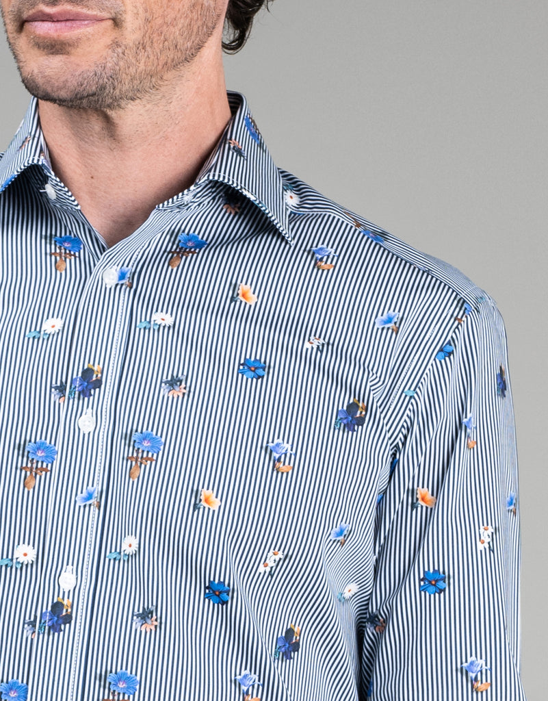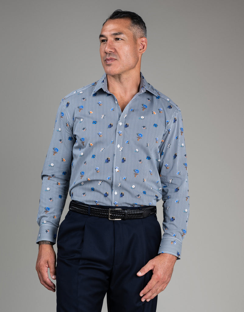 Sophisticated navy base meets botanical charm in this Italian-woven shirt. Micro-stripes provide understated structure while dimensional florals add visual intrigue across the fabric. The tailored silhouette drapes gracefully through the shoulders and chest, with barrel cuffs completing the refined aesthetic. Crafted from pure cotton, it's equally at home layered over a tee or worn as a standalone piece. A versatile wardrobe essential that bridges casual and polished dressing.