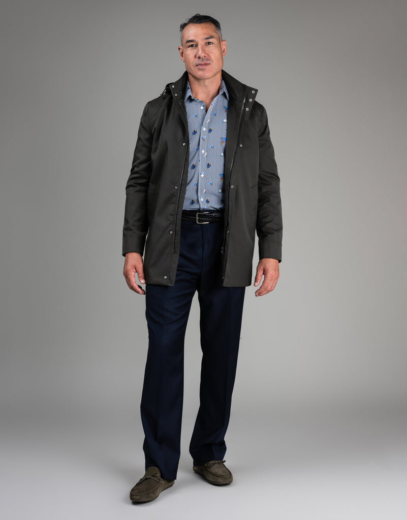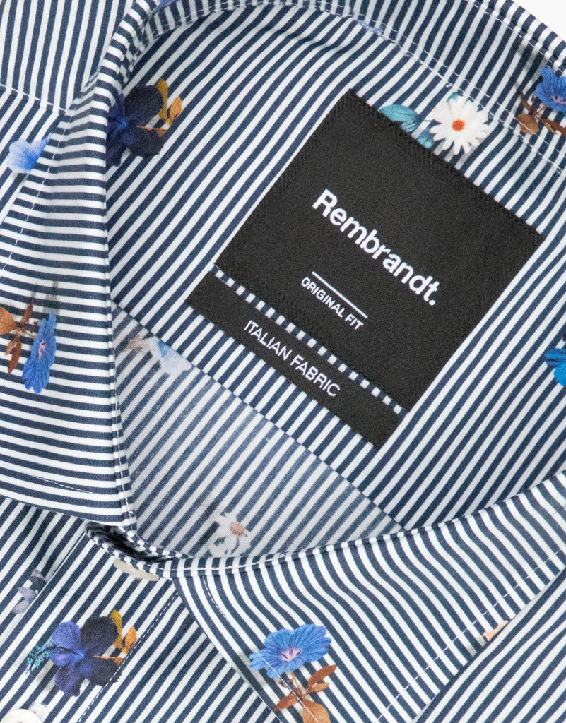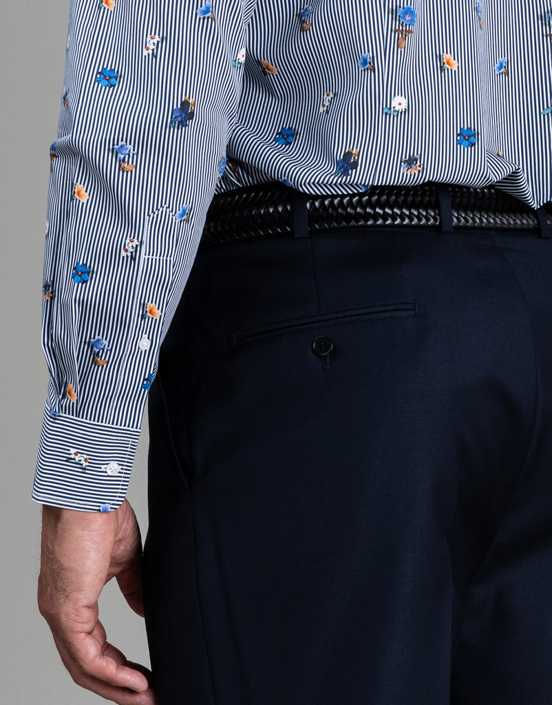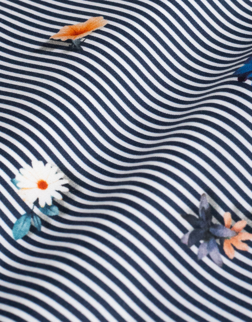 Sophisticated navy base meets botanical charm in this Italian-woven shirt. Micro-stripes provide understated structure while dimensional florals add visual intrigue across the fabric. The tailored silhouette drapes gracefully through the shoulders and chest, with barrel cuffs completing the refined aesthetic. Crafted from pure cotton, it's equally at home layered over a tee or worn as a standalone piece. A versatile wardrobe essential that bridges casual and polished dressing.