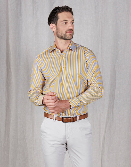 This stylish shirt will freshen up your officewear — keeping you look sharp, courtesy of its tailored slim fit and contemporary bold yellow stripe. Expertly crafted with comfort in mind, it is cut from a soft and breathable pure cotton fabric that has moisture-wicking qualities. The London Yellow Stripe Shirt is an ideal choice for comfortable, modern styling at the office. It is tailored to provide a slim fit and flexible with a soft cotton material that moves with you.