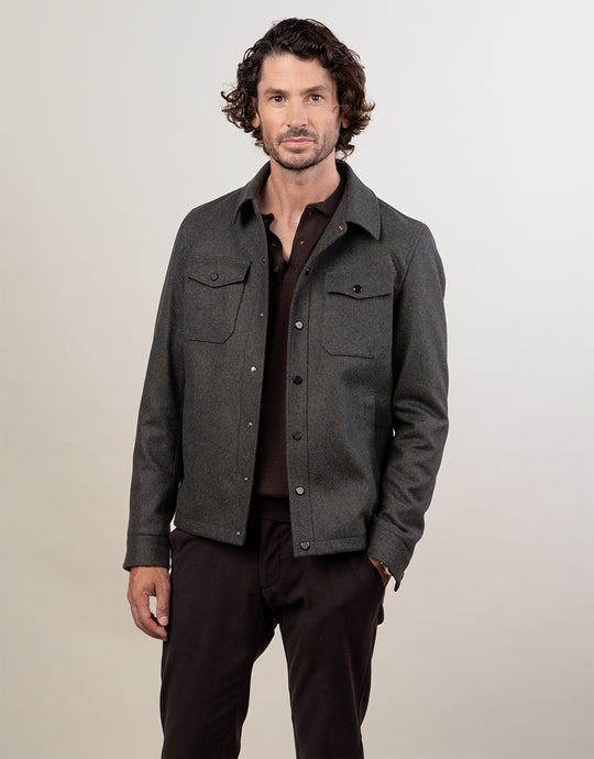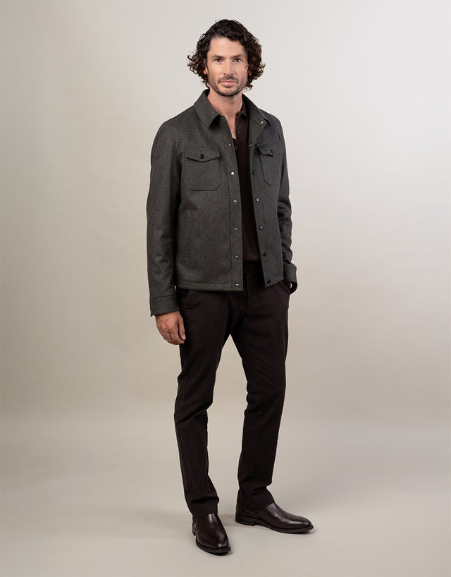 A trucker jacket with a sophisticated edge, the Makara Green Jacket is crafted from premium Italian wool-blend fabric for warmth and durability. The snap button closure, chest pockets, and lined interior add both function and comfort, making it an easy layering piece for any season. Available in Short and Tall sizes, this jacket is designed for a fit that feels just right.