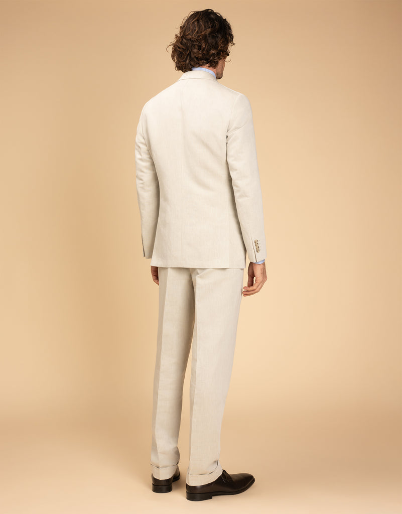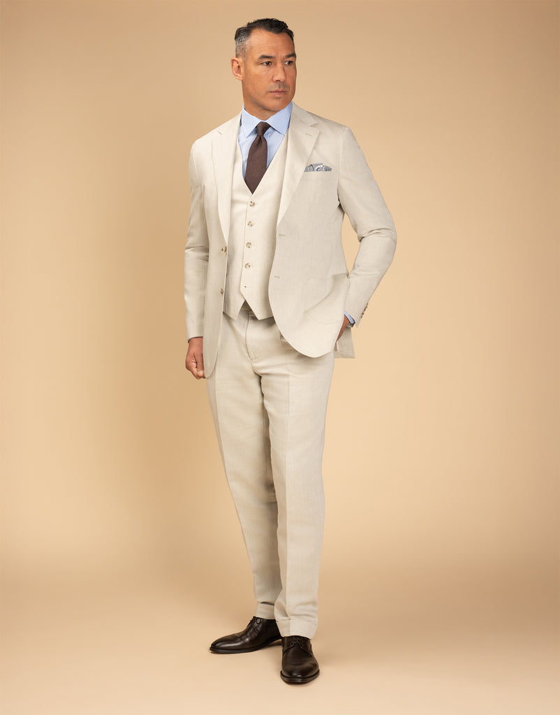 Get ready to elevate your summer style with the Malta Beige Linen Blend Suit. This light bone colored suit is made from high-quality Italian fabrics, ensuring both luxurious feel and durable wear. Perfect for any summer event, its tailored fit offers just the right amount of versatility. Complete your look with the Malta Blazer, Evans Trouser, and Churchill Waistcoat for a sharp and stylish three-piece suit that will turn heads wherever you go!
