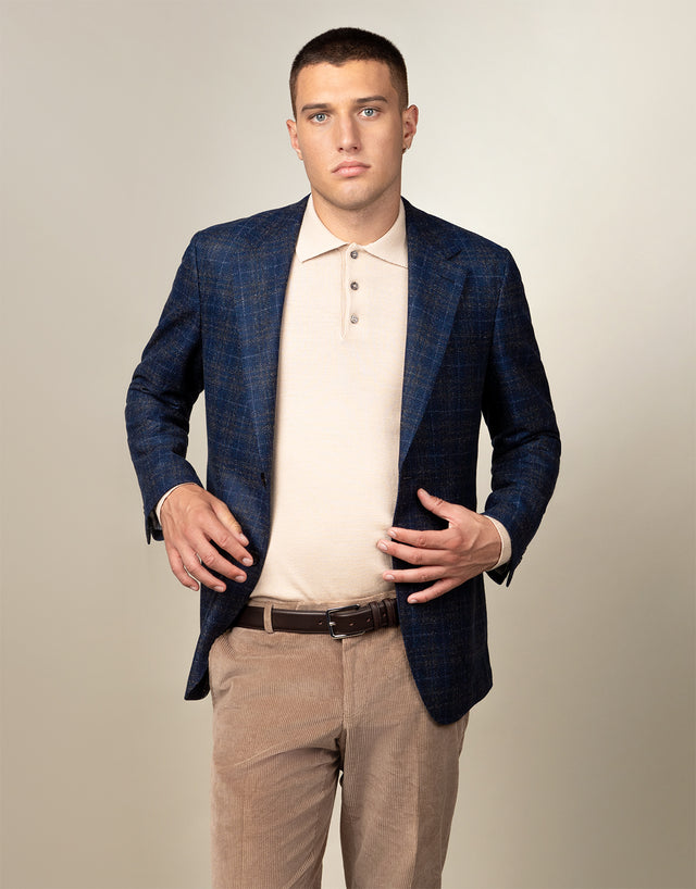 The Malta Navy & Brown Check Blazer is a balance of structure and ease, featuring a soft construction, half lining, and side vents for all-day comfort. The Italian wool-cashmere blend ensures a lightweight yet refined feel, while patch pockets and pick stitching add a modern touch. Perfect for layering, it’s a versatile go-to for smart or casual styling.