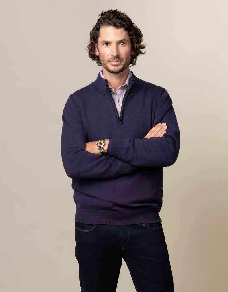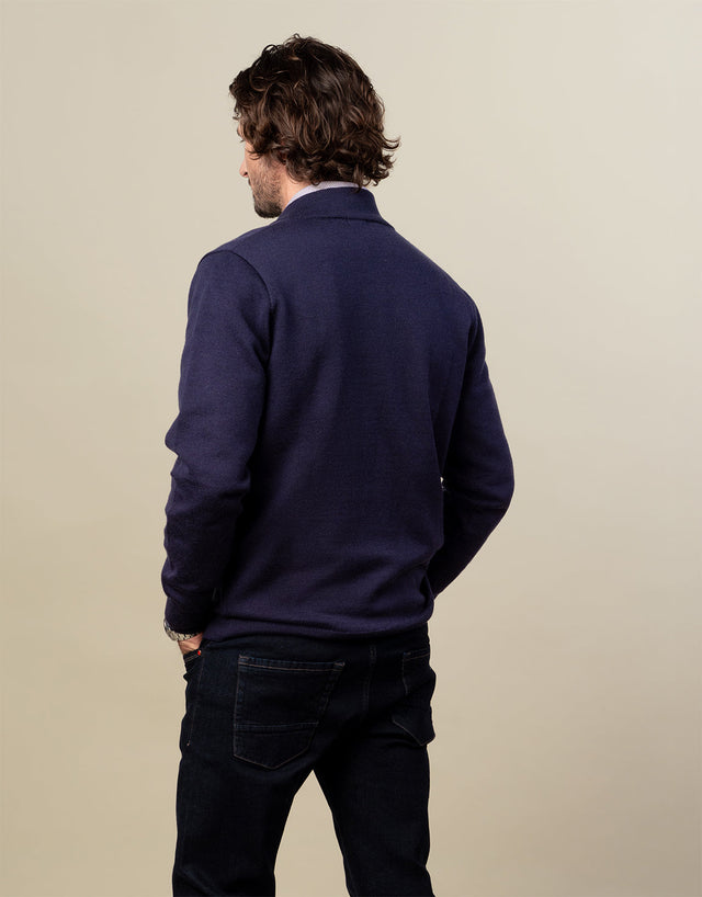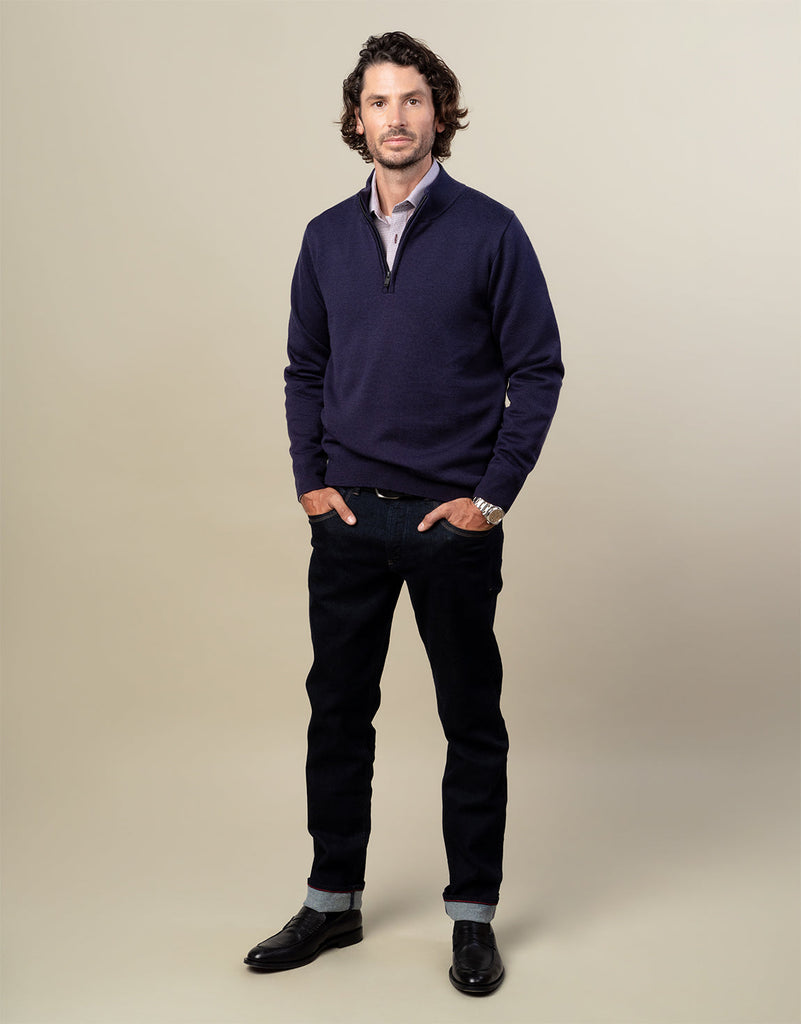 Discover ultimate comfort with the indigo blue 1/4 zip jersey, crafted from high-quality Merino wool for warmth and breathability. The two-ply yarns in the weaving process prevent piling, maintain shape, and create the ideal fit for everyday winter wear.