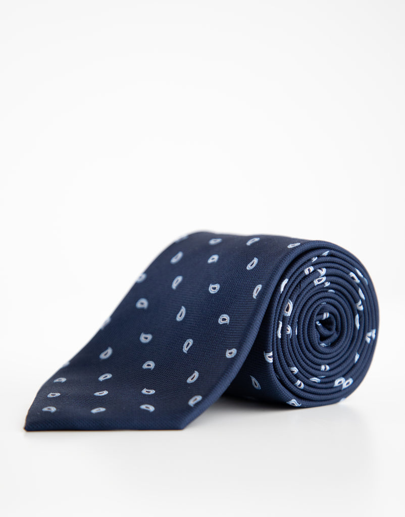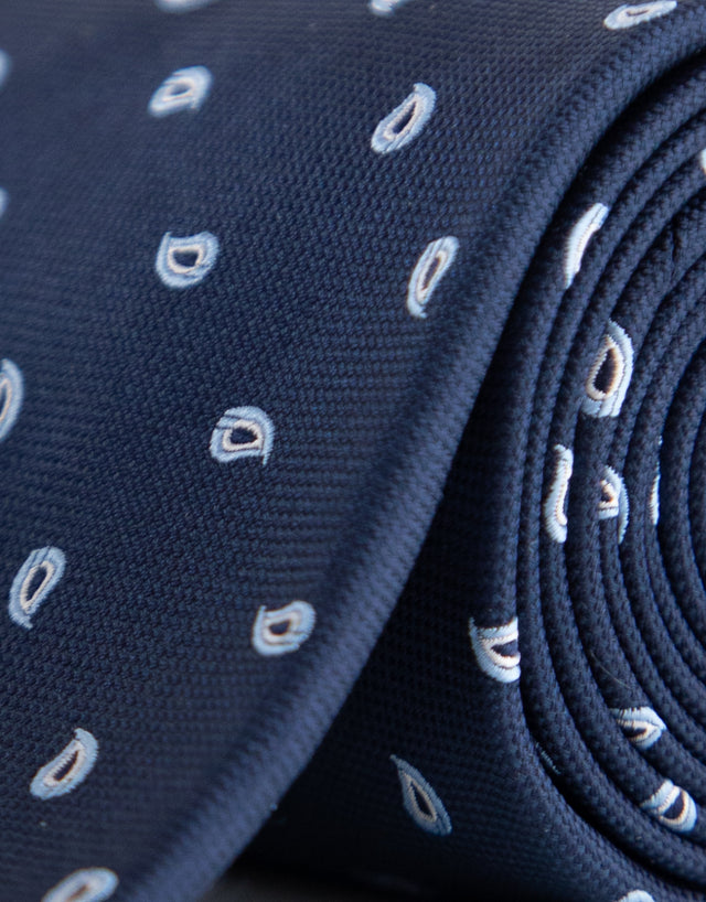 This navy and blue silk tie offers a sophisticated take on pattern. The small-scale paisley adds texture without overpowering, while the tonal palette keeps things sharp and versatile. Cut to a classic 8cm width—it’s a dependable choice for the workweek and beyond.