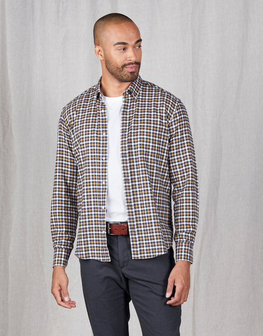 This slim-fit blue & camel check flannel shirt is crafted from 100% brushed cotton for superior softness and warmth. It features a front pocket and button-down collar, making it easy to combine with jeans, chinos, or trousers to complete your smart-casual look.