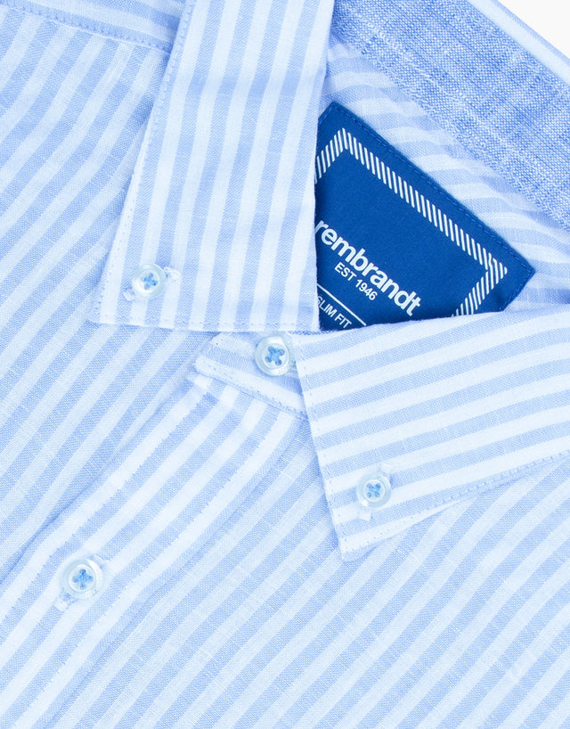 Button-down shirts are perfectly suited to smart-casual and business-casual wear. This blue stripe is cut in Ohope, our slim fit casual shirt which features a button-down collar and a pocket on the chest.