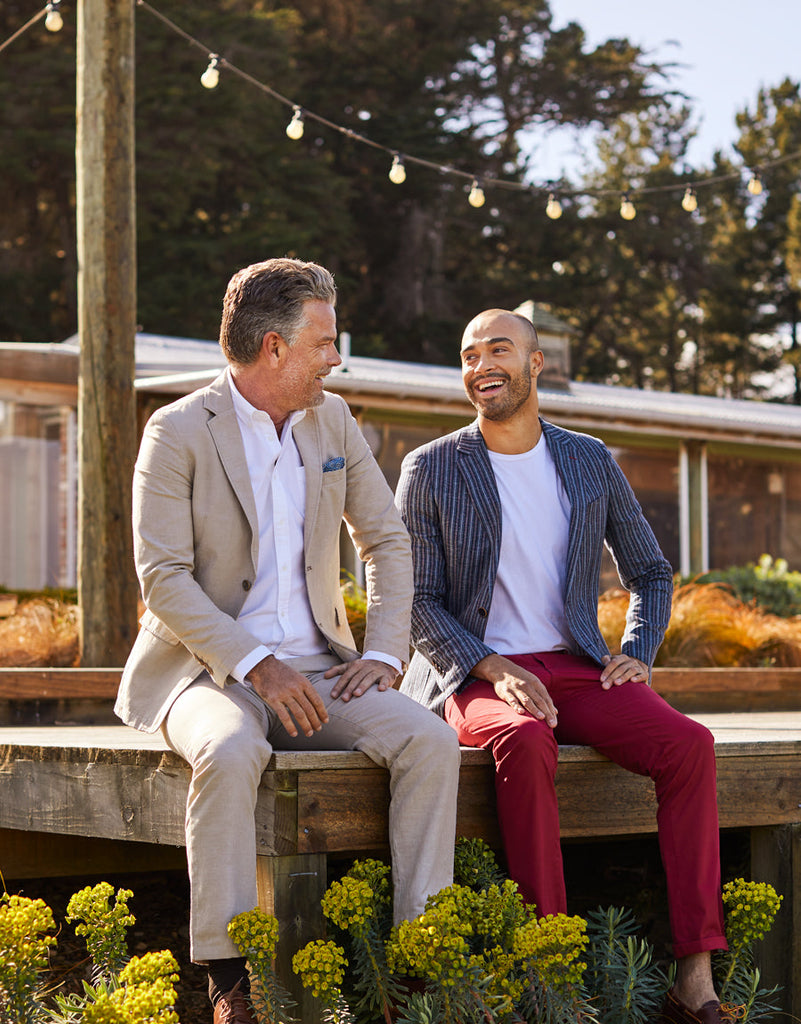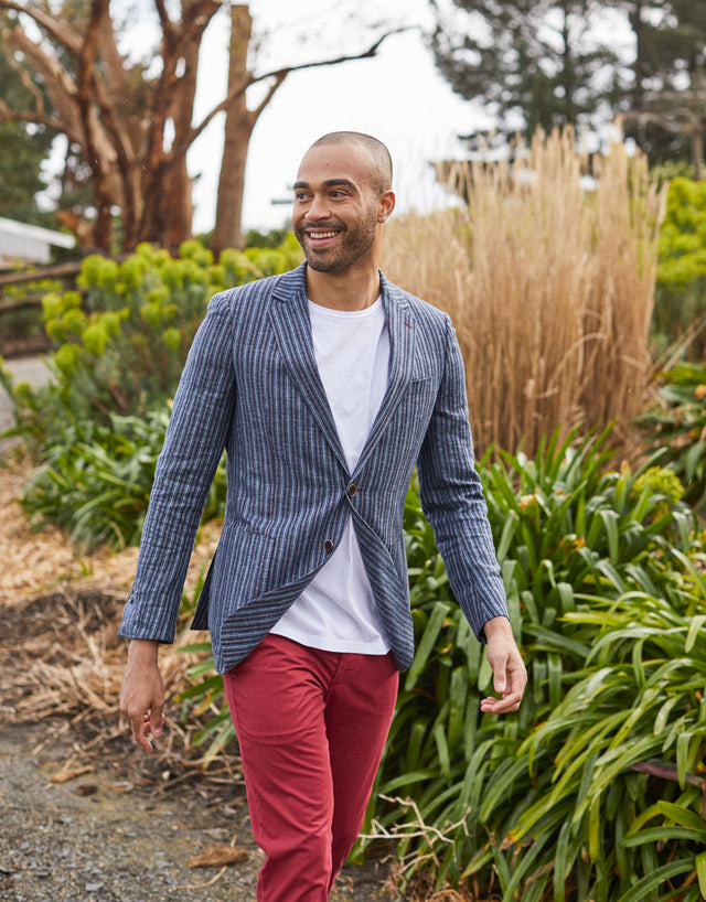 Make a statement in our stripe Pearse blazer. Cut from an Italian fabric that blends cotton & elastane, this blazer is unlined with patch pockets.