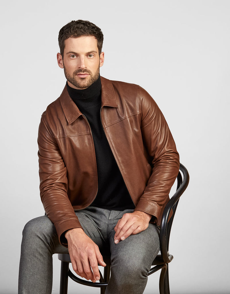 Our latest take on the classic leather jacket, cut from a beautifully rich shade of tobacco brown lamb nappa. Crafted from the finest quality lamb nappa, this jacket features a timeless tobacco brown hue. Designed with expert precision, it's the perfect addition to any wardrobe for a touch of luxury and style.