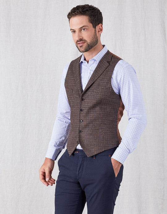 Crafted from a premium blend of wool, cotton, linen and a hint of elastane for added comfort with a pleasing tactile finish, it is tailored with a front label suited for any smart-casual attire. Our gun check Shelby waistcoat can be worn three ways: with a matching blazer, under a contrasting blazer, or over a shirt. The choice is yours.