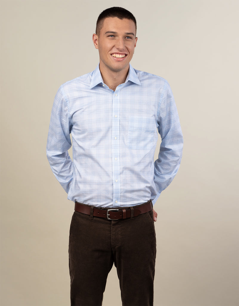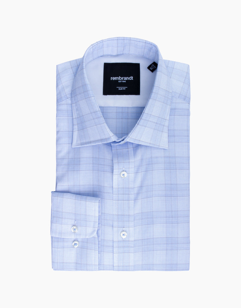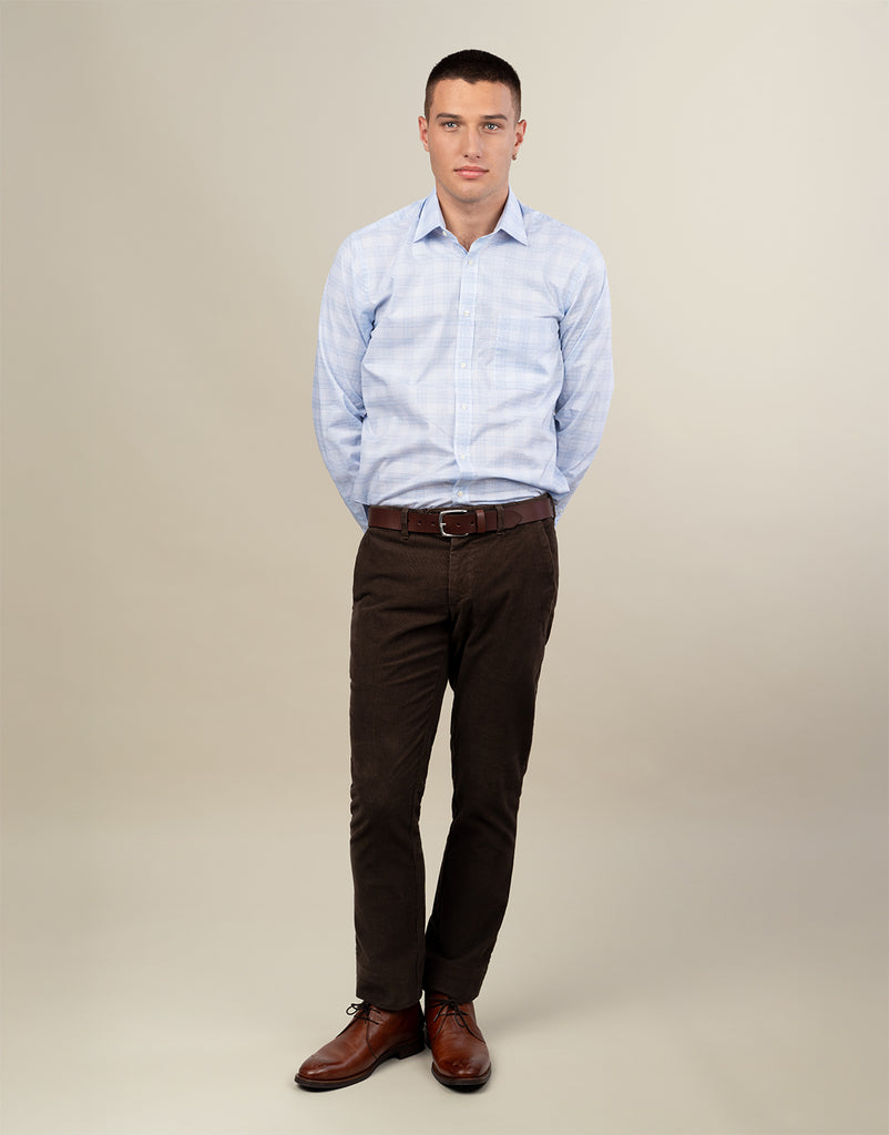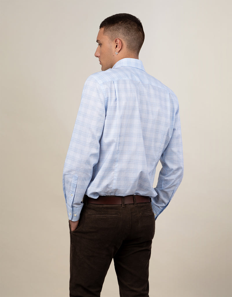 The Sinatra Light Blue Glen Check Shirt is crafted from 100% cotton for a soft, breathable feel that ensures comfort throughout the day. Featuring a classic light blue Glen check pattern, this shirt is versatile enough to wear for both formal and casual occasions.