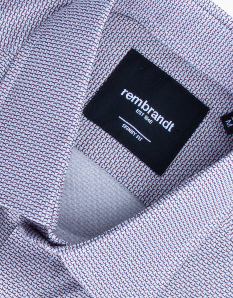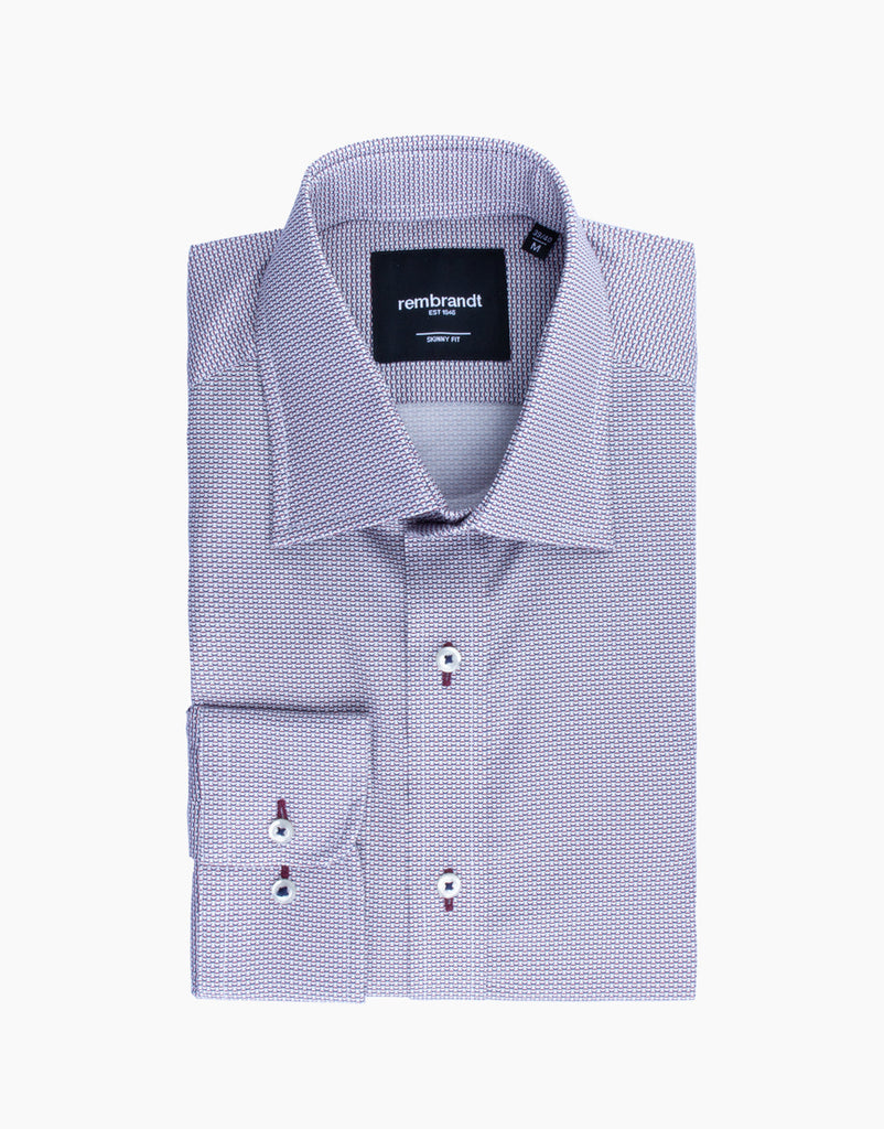 Step up your style with the Sinatra Maroon & Navy Geo Print Shirt. Made from a blend of 97% cotton and 3% elastane, this shirt offers superior comfort with a hint of stretch for the perfect fit. The maroon and navy geo print gives it a modern, eye-catching look that pairs well with both casual and smart-casual outfits.