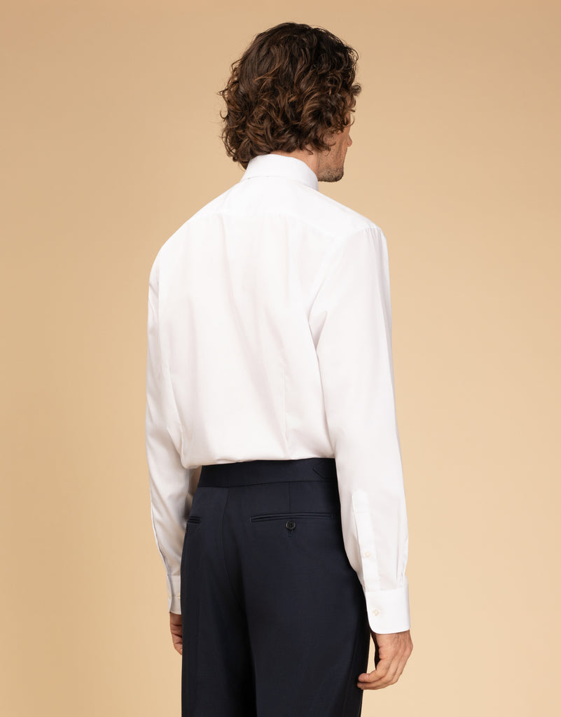 The Sinatra White Fine Twill Shirt is crafted for today’s professionals who value style, fabric, and fit in a top-quality shirt that’s perfect for work and formal occasions. Made from soft cotton, it’s crease-resistant and simple to iron, ensuring you stay comfortable all day. With a classic chest pocket and back pleats for added mobility, this shirt offers both practicality and polished elegance.