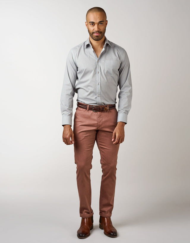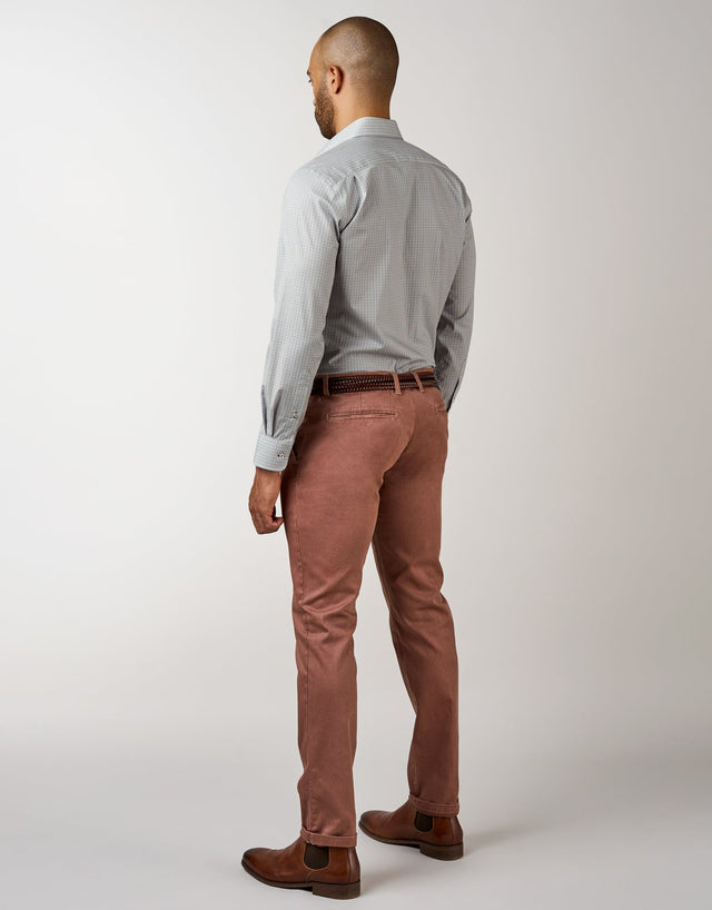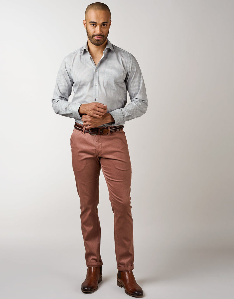 Crafted for a balanced look between casual and formal attire, our Soho Terracotta Chinos are tailored to perfection, featuring a 98% cotton and 2% elastane composition with a lightly brushed finish that gracefully tapers to the ankle. Style them with dress shoes and a crisp cotton shirt or sneakers and an oversized tee.