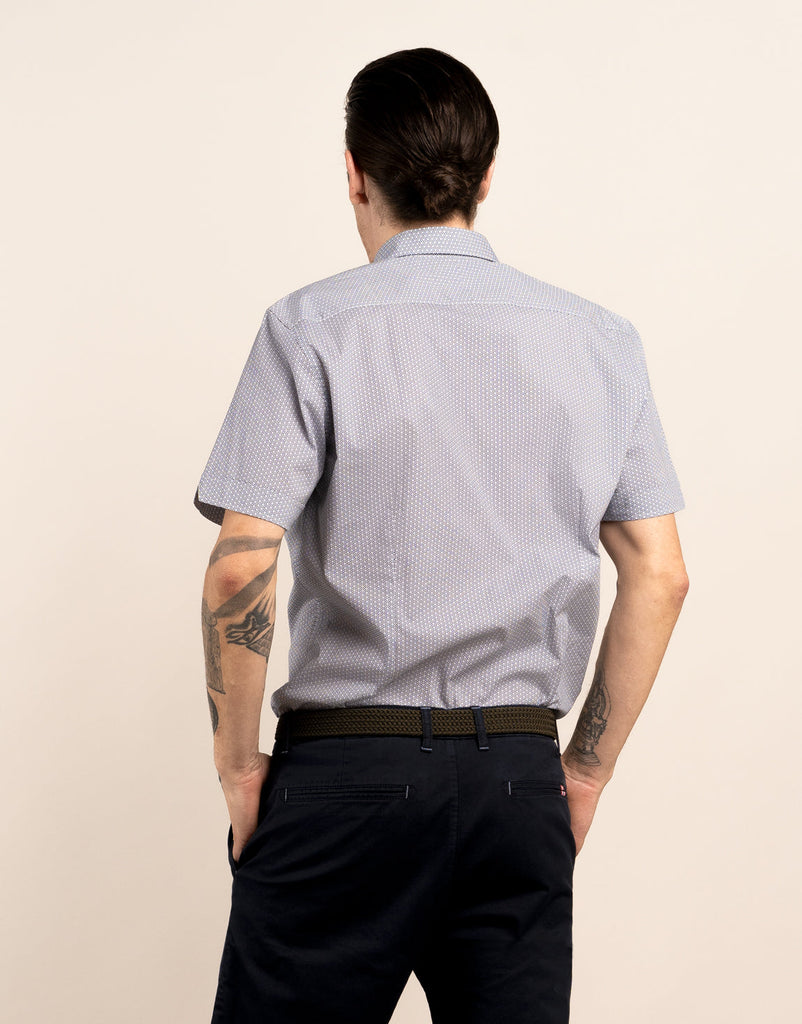 - Short sleeve shirt with hidden button-down collar