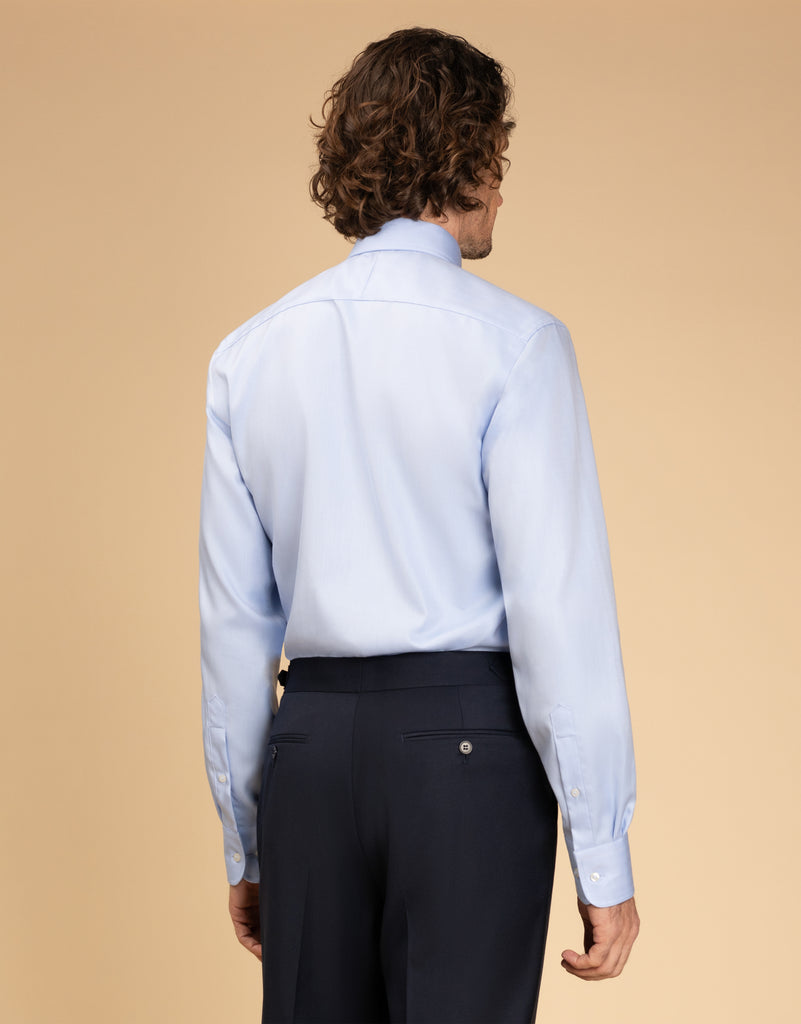 Meet your new everyday essential for work. The York Light Blue Herringbone Non-Iron Shirt is made from 100% cotton with a stylish herringbone pattern, blending the timeless look of a crisp dress shirt with the convenience of a non-iron finish. Thanks to its wrinkle-resistant design, you can wear it all day without worrying about creases.
